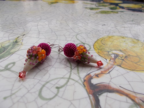 Auf Pinterest habe ich neulich diese verspielten lampwork beads von Laura Critchfield entdeckt und mich gleich verliebt. Der link führte dann zum etsy-Shop und ich konnte nicht widerstehen. Ein paar Tage später hatte ich dann diese wundervollen Glasperlen in der Hand. Die passenden Bicones waren ebenfalls im Päckchen. So habe ich mir noch schnell 2 passende Kugeln gehäkelt und schon war ein für mich sehr ungewöhnliches Paar Ohrringe fertig.